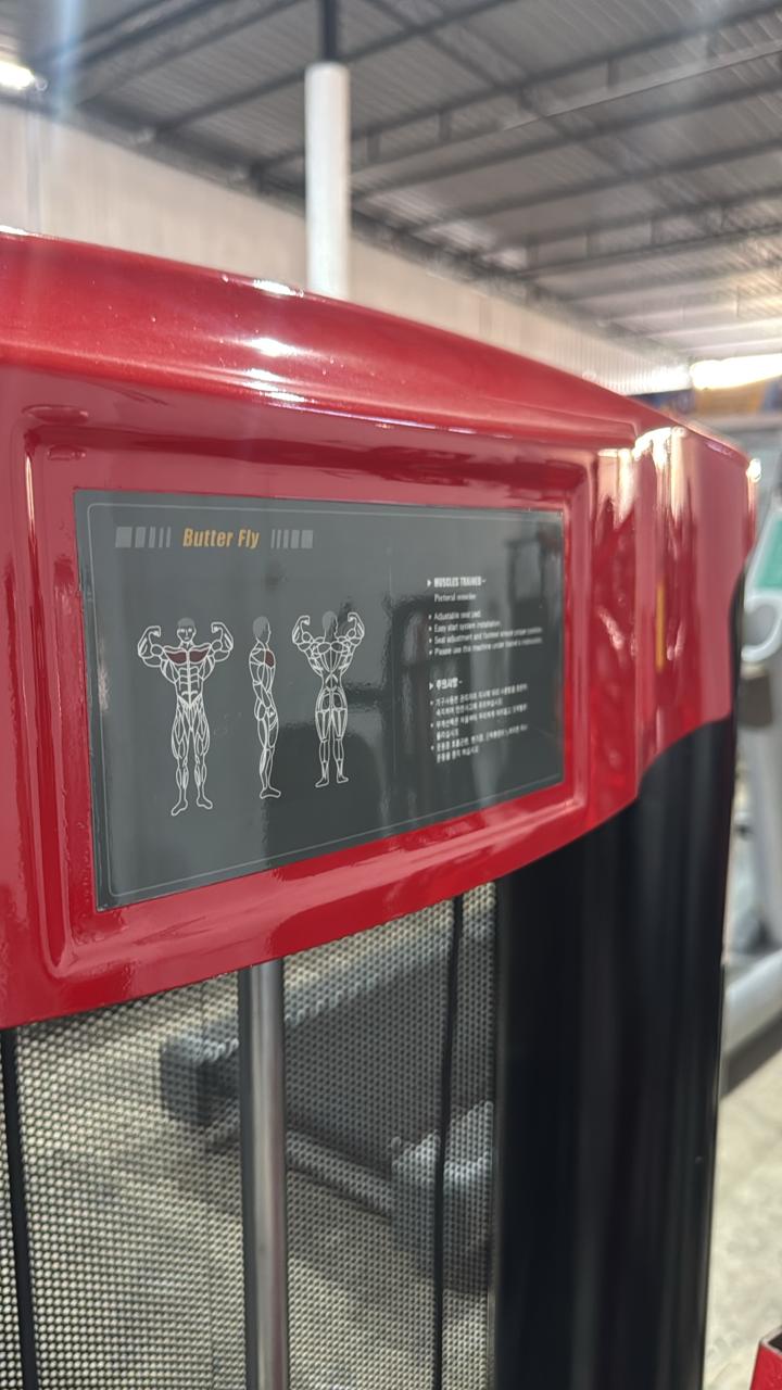 The gym equipment is a seated chest press machine, a popular piece of commercial-grade strength training equipment designed to safely and effectively target your upper body muscles. Key Features & Description Function & Muscles Targeted: This machine primarily works the pectoral muscles (chest), with secondary engagement of the anterior deltoids (shoulders) and triceps. Mechanism: It is a selectorized, pin-loaded machine, meaning a weight stack is used and the user simply inserts a pin into the desired weight plate to set the resistance level. Movement & Safety: The machine provides a fixed, guided path of motion, which helps ensure proper form and minimises the need for stabilising muscles compared to free-weight exercises like the bench press. This makes it ideal for beginners or those in rehabilitation. Adjustability: The seat height can be easily adjusted to align the handles with the user's mid-chest level, accommodating different body sizes and ensuring proper muscle targeting. Build Quality: This type of commercial equipment typically features an 11-gauge steel frame, durable upholstery with high-density foam, and a powder-coat finish to withstand heavy use in a gym environment.