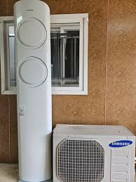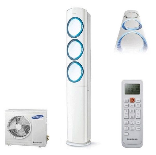 Samsung AF9000 Floor-Standing Air Conditioner – Description The Samsung AF9000 is a premium floor-standing (tower-type) air conditioner designed for large rooms, halls, offices, and commercial spaces. It features a sleek, modern vertical design with a glossy white finish, allowing it to blend easily into modern interiors without wall installation. Design & Airflow Tall tower-style body with a stable base Dual circular air outlets on the front for strong and wide air distribution Side vents help improve even airflow across the room Minimalist and elegant appearance Performance Features Powerful cooling capacity suitable for large areas Digital Inverter Technology for energy efficiency and stable temperature Fast cooling to quickly reduce room temperature Consistent airflow for uniform comfort Comfort & Convenience Multiple operating modes (Cool, Auto, Turbo, Sleep*) Remote control operation Low-noise performance compared to traditional high-capacity AC units Auto-restart function after power failure Air Quality Built-in air filtration system Helps reduce dust and airborne particles Dehumidification for improved indoor comfort Ideal For ✔ Living halls ✔ Showrooms ✔ Offices ✔ Mosques / banquet halls ✔ Large commercial spaces If you want, I can also provide: Short description for quotation Specification sheet Advantages vs wall-mounted AC Installation requirements
