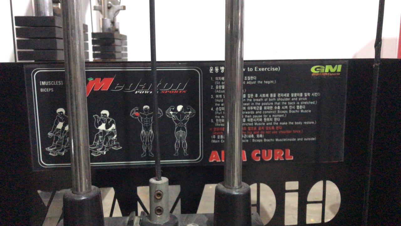 The equipment is a commercial-grade seated biceps curl machine, featuring a robust black steel frame with contrasting red adjustment points and movement arms. Design and Build The machine has a heavy-duty frame (often steel tubing) finished in black, designed for durability in a gym environment. Key components for user interaction, such as adjustment levers and the main cam/lever mechanism, are highlighted in bright red. It utilizes a pin-loaded weight stack system enclosed within the main upright structure for adjustable resistance. Ergonomics and Function The primary function is to provide an isolated and controlled exercise for the biceps muscle. Arm Pad: A large, angled black padded rest supports the user's upper arms and chest, ensuring the elbows are correctly positioned and preventing shoulder involvement or cheating with momentum. Seat: A black padded seat is typically adjustable vertically to accommodate users of different heights. Handles: The user grips handles attached to the red moving arm, which rotates around a fixed pivot point. Movement: The machine guides the user through a natural arc of movement, focusing the contraction purely on the biceps brachii.