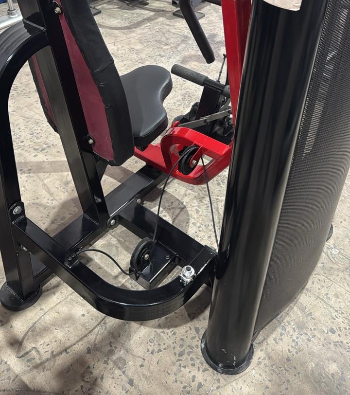The gym equipment is a seated chest press machine, a popular piece of commercial-grade strength training equipment designed to safely and effectively target your upper body muscles. Key Features & Description Function & Muscles Targeted: This machine primarily works the pectoral muscles (chest), with secondary engagement of the anterior deltoids (shoulders) and triceps. Mechanism: It is a selectorized, pin-loaded machine, meaning a weight stack is used and the user simply inserts a pin into the desired weight plate to set the resistance level. Movement & Safety: The machine provides a fixed, guided path of motion, which helps ensure proper form and minimises the need for stabilising muscles compared to free-weight exercises like the bench press. This makes it ideal for beginners or those in rehabilitation. Adjustability: The seat height can be easily adjusted to align the handles with the user's mid-chest level, accommodating different body sizes and ensuring proper muscle targeting. Build Quality: This type of commercial equipment typically features an 11-gauge steel frame, durable upholstery with high-density foam, and a powder-coat finish to withstand heavy use in a gym environment.