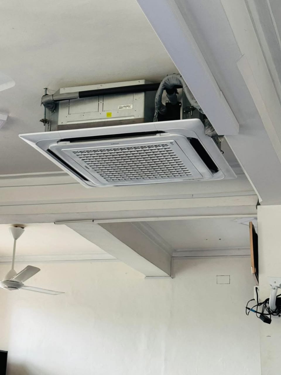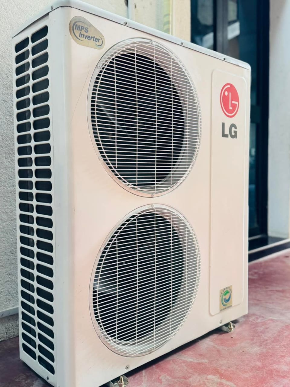 LG Smart Inverter Outdoor Unit, which is typical for a commercial or large residential air conditioning system, specifically a Multi-Split or a small VRF (Variable Refrigerant Flow) system. Key Features and Identification: Brand and Technology: The unit is clearly marked with the LG logo and the word INVERTER, indicating it uses LG's advanced Smart Inverter technology. This technology allows the compressor speed to be varied, leading to high energy efficiency, precise temperature control, and faster cooling/heating compared to older, non-inverter systems. Design: It is a side-discharge outdoor unit (air is drawn in from the back/sides and expelled through the front grilles). Fan Configuration: The unit features two large axial fans stacked vertically. This dual-fan design suggests a higher capacity model, commonly found in commercial applications like the LG MULTI V S or a high-capacity Multi-Split unit. These systems can connect a single outdoor unit to multiple indoor units (like the ceiling cassette you showed previously). Application: Given its size and dual-fan design, this unit is likely intended for: Light Commercial Use: Such as small offices, retail spaces, or restaurants. Large Residential Use: Providing climate control for an entire home with multiple zones. Structure: It has a durable, boxy, white metal casing with large protective grilles over the fans. It appears to be a robust, high-capacity unit designed for outdoor installation. This type of system is a modern, high-performance solution for flexible and energy-efficient climate control across multiple areas.
