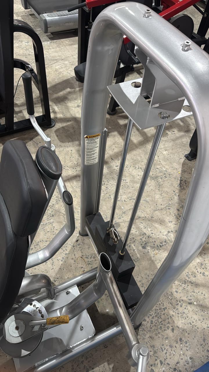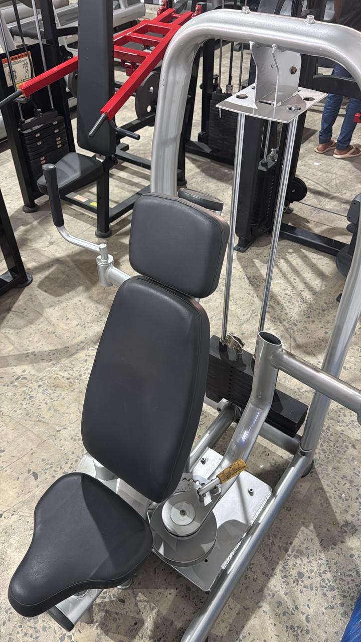 The machine is a Life Fitness Signature Series shoulder press unit, a commercial-grade piece of gym equipment designed for effective and safe upper body strength training. Key Features and Description Function and Biomechanics: The primary function is to work the deltoid (shoulder) muscles and triceps. It uses converging press arms that follow a natural overhead pressing movement path, which ensures proper biomechanics and minimizes the need for user stabilization. This makes it suitable for both beginners and experienced lifters. Safety and Ease of Use: The fixed path of motion provides a controlled and safe environment, reducing the risk of injury associated with free weights. It includes clear instructional placards that illustrate proper use and the muscles trained. Adjustability: The machine features an adjustable seat to accommodate a wide range of user sizes and ensure optimal alignment. It also has multiple grip positions (neutral and pronated) for exercise variety. Construction: It is built with a heavy-duty, 11-gauge steel frame and durable, contoured, double-stitched Naugahyde upholstery designed for long-term commercial use. Weight System: The machine uses a pin-loaded weight stack, often with an integrated incremental weight system that allows for micro-adjustments in resistance with the turn of a dial.